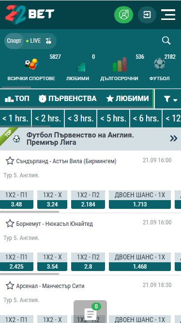 22Bet BG предлага на своите клиенти една от най-богатите спортни секции на пазара. Независимо дали сте начинаещ или опитен играч, тук ще откриете хиляди пазари и събития всеки ден – от най-големите международни първенства до по-малки регионални лиги и нишови дисциплини.