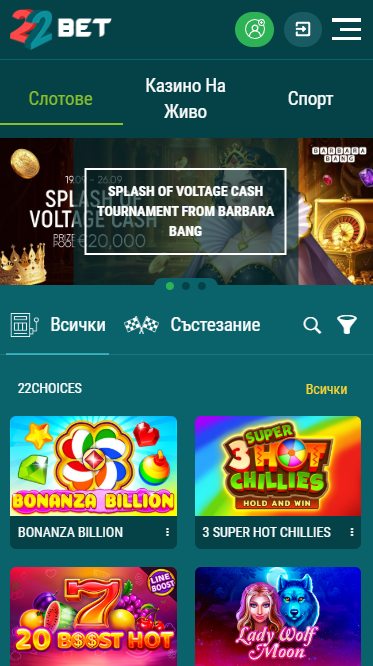 22Bet е модерен международен оператор за спортни залози и казино, изграден върху бърза и интуитивна платформа. Брандът работи с лиценз от Кюрасао (№ 8048/JAZ2017-067) и приема играчи от България, като предлага напълно преведен интерфейс на български. В секцията Спорт ще откриете над 35 дисциплини с прематч и live пазари, дългосрочни залози, е-спортове, функции като Cash Out и Bet Builder, както и пряко предаване за част от събитията. Налични са мобилно приложение (APK/PWA), удобни плащания в BGN и активна бонус програма с начален бонус, седмични оферти и промоции за редовни клиенти.