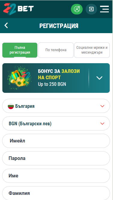 Процедурата за регистрация в 22Bet BG е лесна и включва няколко стъпки: